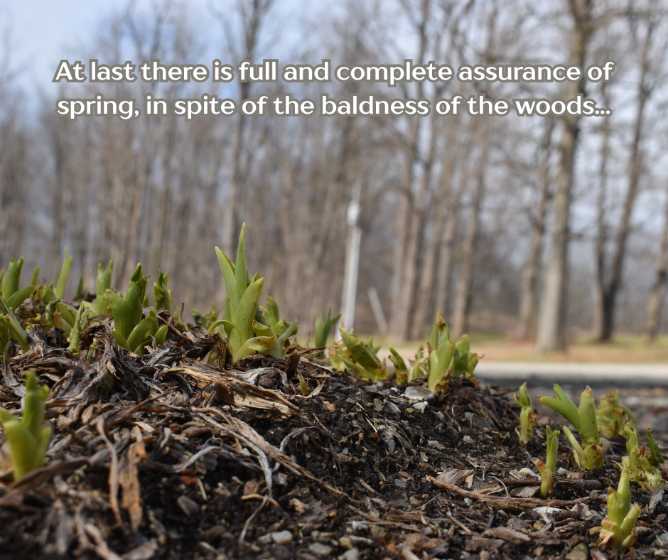 At last there is full and complete assurance of spring, in spite of the baldness of the woods, the barrenness of the fields, bleak with sodden furrows of last year’s ploughing, or pallidly tawny with bleached grass, and untidy with the jetsam of winter storms and the wide strewn litter of farms in months of foddering and wood-hauling.